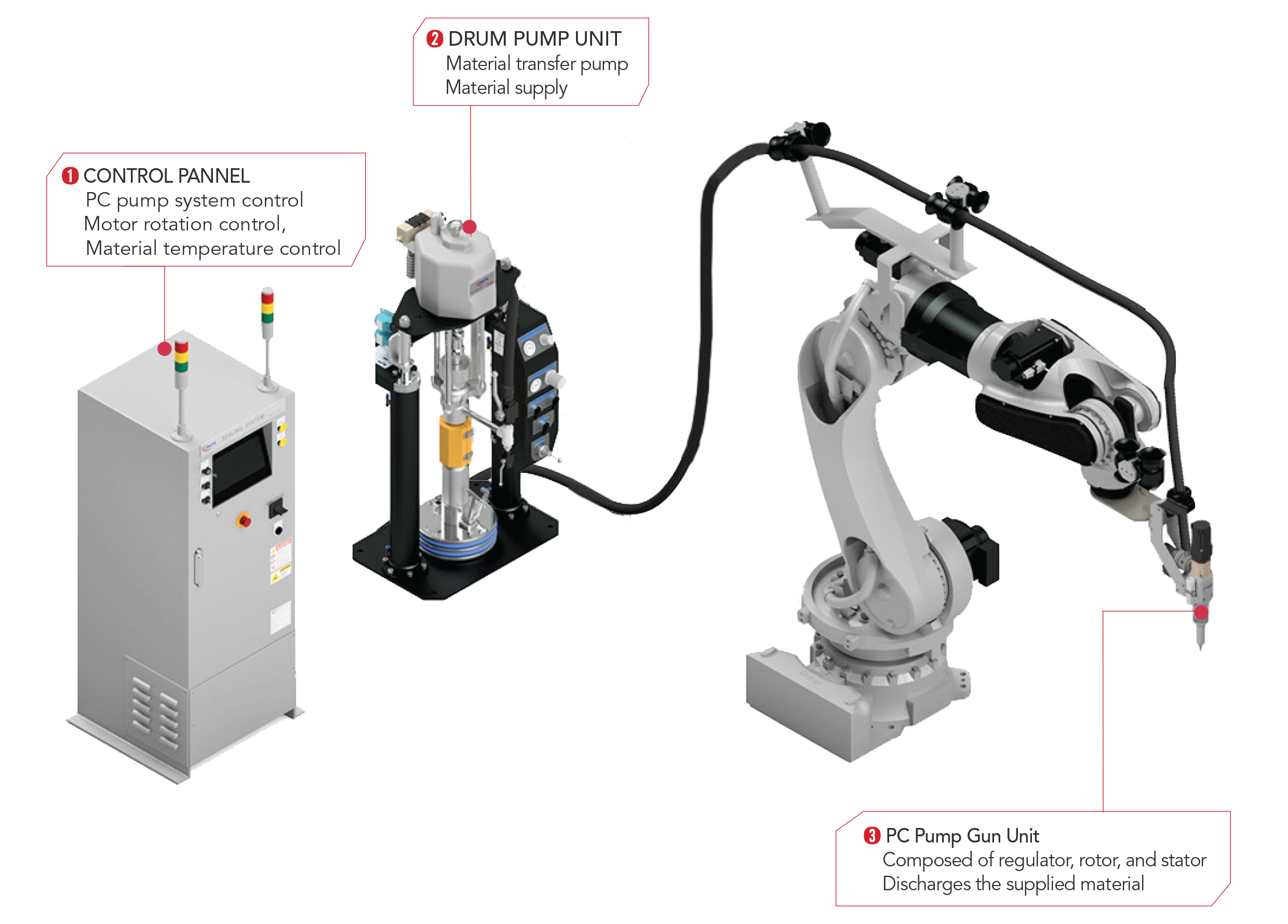 This advanced pumping system utilizes a rotating rotor to continuously transfer fluid through the cavities formed between the rotor and stator. The internal rotation provides simultaneous discharge and sealing, delivering smooth, pulseless material flow with precise control through a servo-driven motor system. Flow rate is adjustable via motor RPM, making the pump ideal for medium to high-viscosity materials, including fluids with suspended particles. Engineered for consistent performance and reliable material handling, it supports a wide range of industrial dispensing applications.